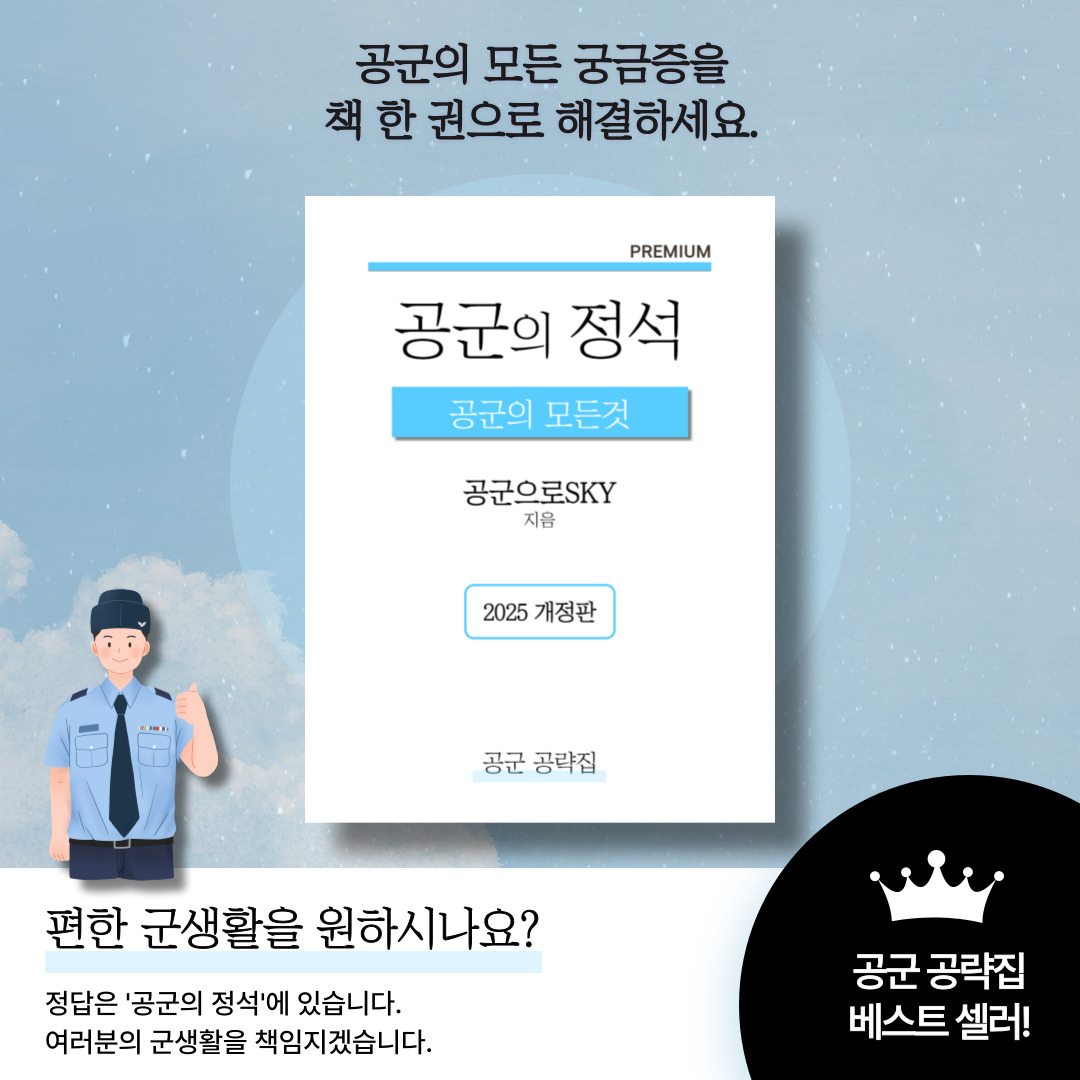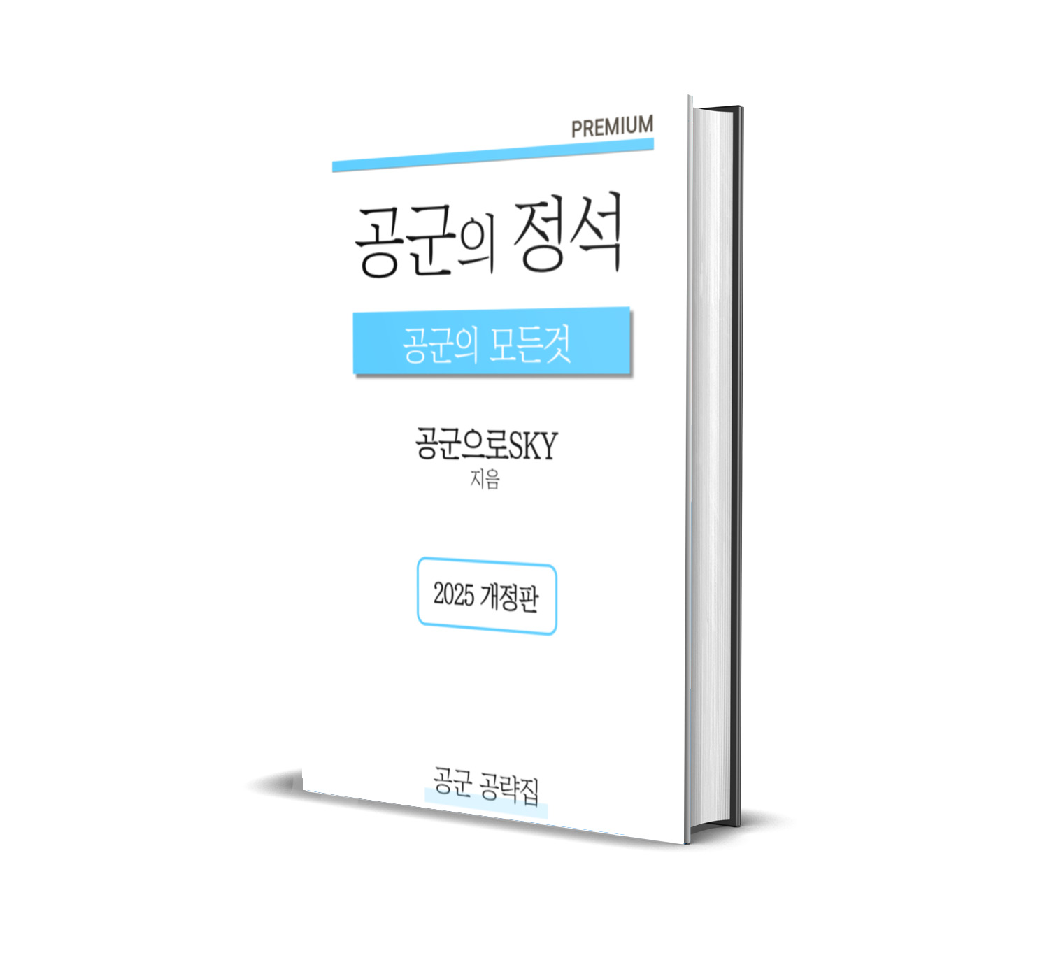 최근《 공군의 정석 》의 전자책 내용뿐만 아니라, 게시물 내의 홍보 문구까지 모방한 유사 전자책이 생겨 많은분들께서《 공군의 정석 》과 혼동하는 경우가 발생하고 있습니다.《 공군의 정석 》이 아닌 다른 공략집을 구매하신 후에는 매월 최신 정보가 업데이트되는 개정판 무료 제공 및 100% 무상, 무제한 A/S가 불가능하오니 필히 하단 워터마크(ⓒ공군의 정석)를 확인하시기 바랍니다.